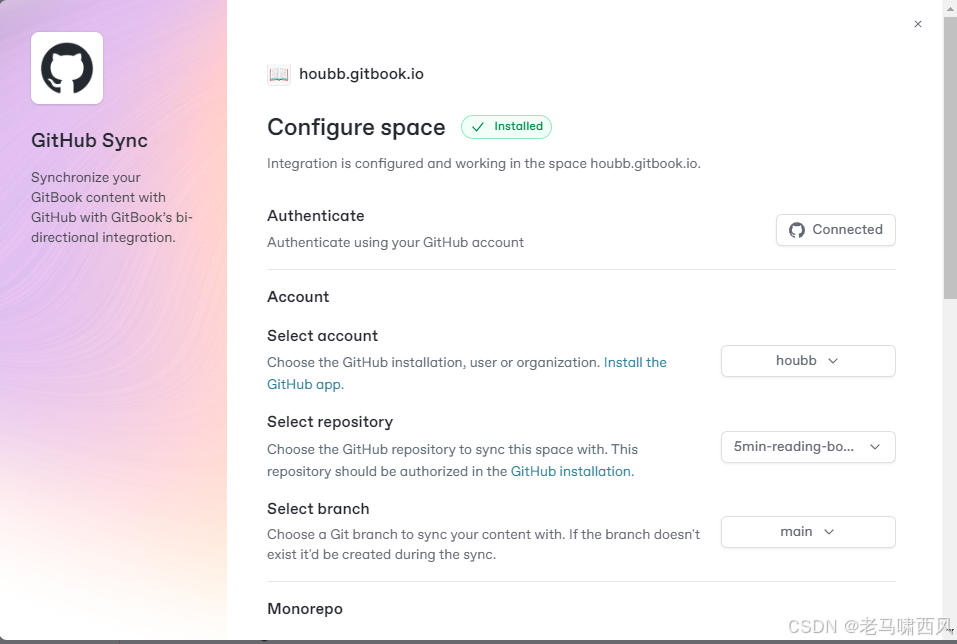 - 需先在 GitHub 上安装 GitBook 应用。若未安装,页面会提示您授权 GitBook 访问特定仓库或所有仓库。