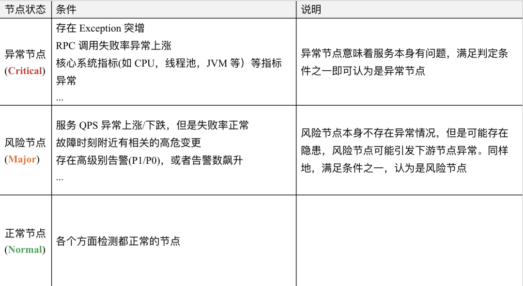 对于拓扑图中的节点,通过异常检测模块后,将其划分为三种状态类型,状态定义分别如下: